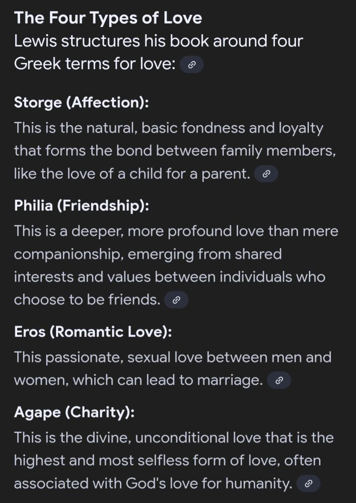 ³ This concept is derived from the major thematics of a book by C.S. Lewis that focuses on some of the theological undercurrents relating to the different ways in which we express love towards others, from Lewis, C.S., The Four Loves, 2021 reprint by Valde Books in conjunction with Amazon Inc. Originally published in 1960.
